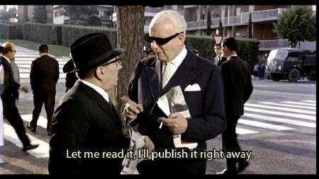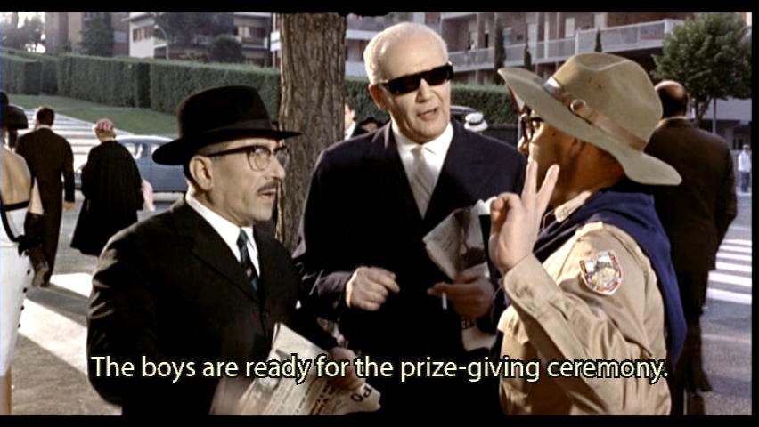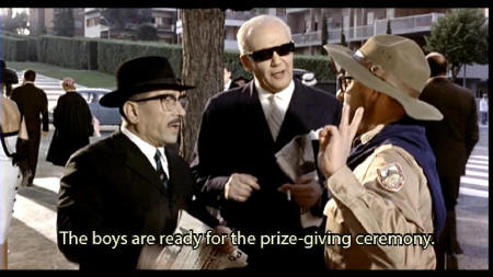 on this, and I entitled it "Lechery in Art." [Antonio] No, not smart. Lechery in art! [Man] Oh, do bring it to me. I'll be happy to publish it. [Antonio] Thank you. [Boyscout] (Stuttering) The scouts are all ready ... [Antonio] ... for me to make the medal awards, is that it? Excuse me, I must go and make the awards now to my young lads. |
