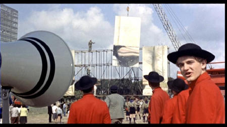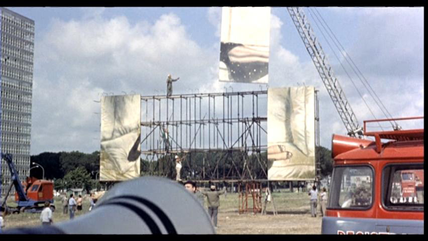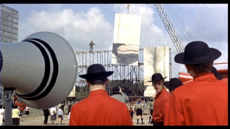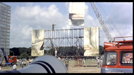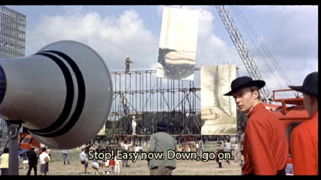 All right. That's about the right height, boys. Lower her down. Down. Lower. Down. Get her to the right a little. Down, will you? Easy does it. Easy. [Cleric] Hey, Hugo. Come here and take a look at this. [Workman] Hey, get away. Don't touch the loudspeaker. Watch what you're doing, will you? Now take it a little over to the left. Hold it. Hey, what are you looking at? Go get the hose, will you? |