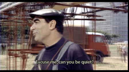 [Workman] Higher! Turn the song on now. The hard work's done. Get to it, you loafers. It's your turn. Excuse me, would you mind stopping a while? |