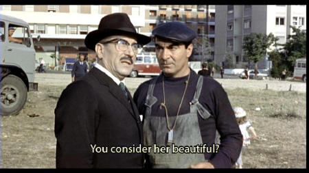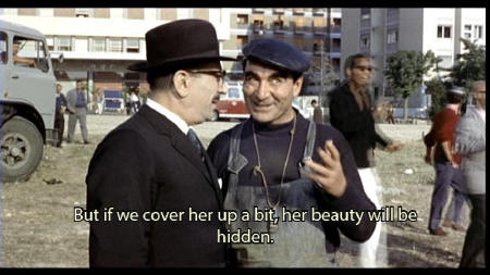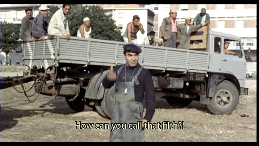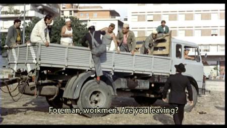 [Workman] But if I would put on a piece of paper there, why the poster would lose its beauty. [Antonio] In other words, you consider it beautiful? [Workman] Come on! We're all ready to leave. [Workman:]Mister, I don't consider her filth, that's for sure. So long. I gotta go. Give me a hand, boys! [Antonio] Just a minute. Don't go away. Listen to me. What's your hurry? Don't go! You've got to stay and do something! You can't go and leave it that way. Please! You'll be sorry you ever did this, you hear? |