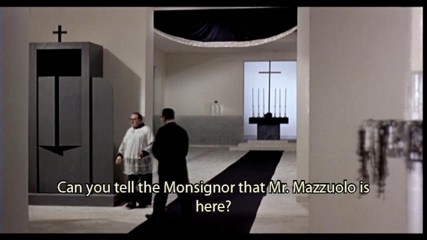 Oh, sexton. I have an appointment with the Bishop. Tell him that Mr. Mazzuolo is calling. [Sexton] The Bishop is indisposed. You can see his secretary. |
