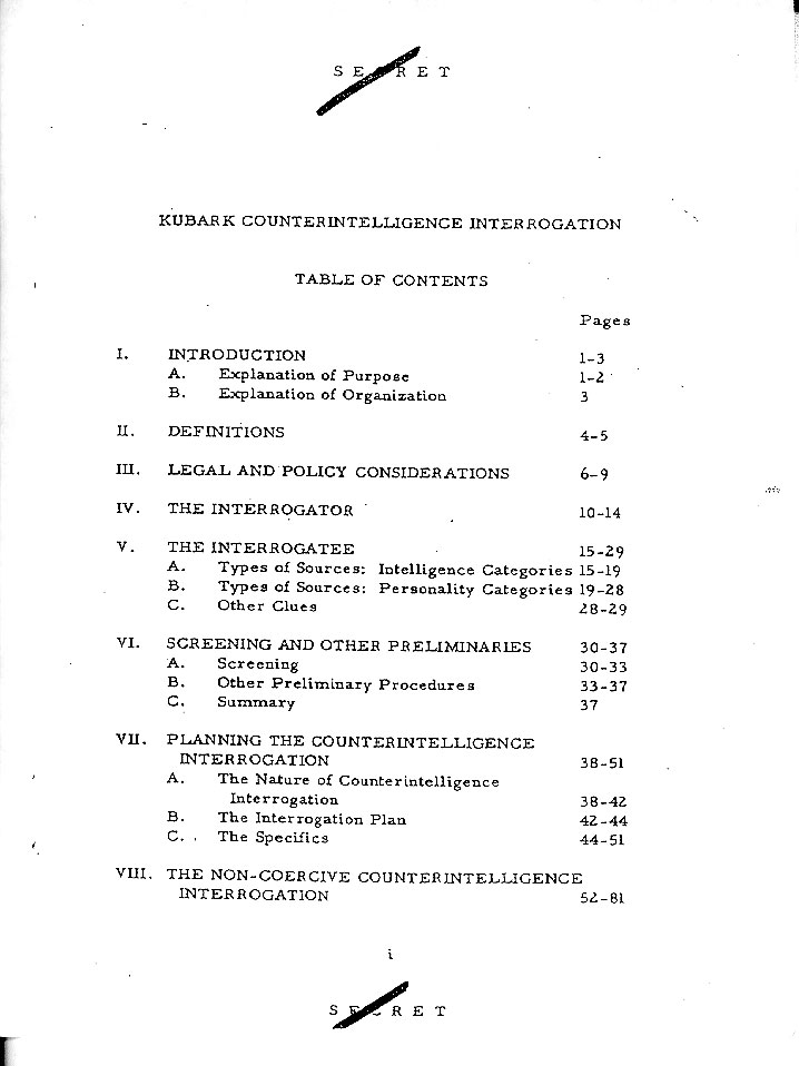 Release KUBARK COUNTERINTELLIGENCE INTERROGATION TABLE OF CONTENTS A. Explanation of Purpose (1-2) B. Explanation of Organization (3)