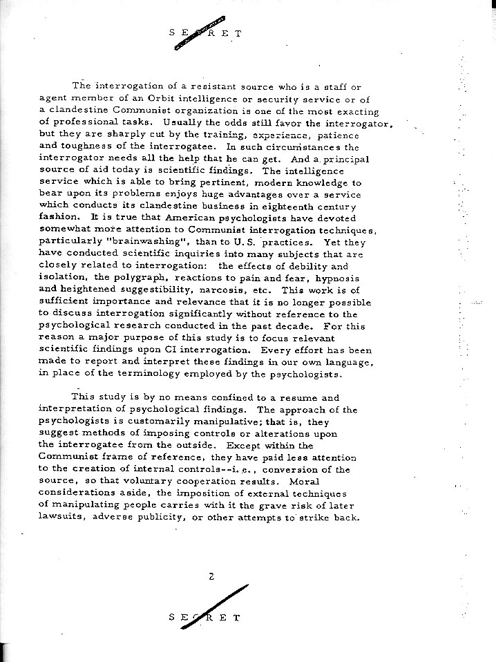 This manual cannot teach anyone how to be, or become, a good interrogator. At best it can help readers to avoid the characteristic mistakes of poor interrogators. Its purpose is to provide guidelines for KUBARK interrogation, and particularly the counterintelligence interrogation of resistant sources. Designed as an aid for interrogators and others immediately concerned, it is based largely upon the published results of extensive research, including scientific inquiries conducted by specialists in closely related subjects. There is nothing mysterious about interrogation. It consists of no more than obtaining needed information through responses to questions. As is true of all craftsmen, some interrogators are more able than others; and some of their superiority may be innate. But sound interrogation nevertheless rests upon a knowledge of the subject matter and on certain broad principles, chiefly psychological, which are not hard to understand. The success of good interrogators depends in large measure upon their use, conscious or not, of these principles and of processes and techniques deriving from them. Knowledge of subject matter and of the basic principles will not of itself create a successful interrogation, but it will make possible the avoidance of mistakes that are characteristic of poor interrogation. The purpose, then, is not to teach the reader how to be a good interrogator but rather to tell him what he must learn in order to become a good interrogator. The interrogation of a resistant source who is a staff or agent member of an Orbit intelligence or security service or of a clandestine Communist organization is one of the most exacting of professional tasks. Usually the odds still favor the interrogator, but they are sharply cut by the training, experience, patience and toughness of the interrogatee. In such circumstances the interrogator needs all the help that he can get. And a principal source of aid today is scientific findings. The intelligence service which is able to bring pertinent, modern knowledge to bear upon its problems enjoys huge advantages over a service which conducts its clandestine business in eighteenth century fashion. It is true that American psychologists have devoted somewhat more attention to Communist interrogation techniques, particularly "brainwashing", than to U.S. practices. Yet they have conducted scientific inquiries into many subjects that are closely related to interrogation: the effects of debility and isolation, the polygraph, reactions to pain and fear, hypnosis and heightened suggestibility, narcosis, etc. This work is of sufficient importance and relevance that it is no longer possible to discuss interrogation significantly without reference to the psychological research conducted in the past decade. For this reason a major purpose of this study is to focus relevant scientific findings upon CI interrogation. Every effort has been made to report and interpret these findings in our own language, in place of the terminology employed by the psychologists. This study is by no means confined to a resume and interpretation of psychological findings. The approach of the psychologists is customarily manipulative; that is, they suggest methods of imposing controls or alterations upon the interrogatee from the outside. Except within the Communist frame of reference, they have paid less attention to the creation of internal controls -- i.e., conversion of the source, so that voluntary cooperation results. Moral considerations aside, the imposition of external techniques of manipulating people carries with it the grave risk of later lawsuits, adverse publicity, or other attempts to strike back. B. Explanation of Organization This study moves from the general topic of interrogation per se (Parts I, II, III, IV, V, and VI) to planning the counterintelligence interrogation (Part VII) to the CI interrogation of resistant sources (Parts VIII, IX, and X). The definitions, legal considerations, and discussions of interrogators and sources, as well as Section VI on screening and other preliminaries, are relevant to all kinds of interrogations. Once it is established that the source is probably a counterintelligence target (in other words, is probably a member of a foreign intelligence or security service, a Communist, or a part of any other group engaged in clandestine activity directed against the national security), the interrogation is planned and conducted accordingly. The CI interrogation techniques are discussed in an order of increasing intensity as the focus on source resistance grows sharper. The last section, on do's and dont's, is a return to the broader view of the opening parts; as a check-list, it is placed last solely for convenience. Most of the intelligence terminology employed here which may once have been ambiguous has been clarified through usage or through KUBARK instructions. For this reason definitions have been omitted for such terms as burn notice, defector, escapee, and refugee. Other definitions have been included despite a common agreement about meaning if the significance is shaded by the context. 1. Assessment: the analysis and synthesis of information, usually about a person or persons, for the purpose of appraisal. The assessment of individuals is based upon the compilation and use of psychological as well as biographic detail. 2. Bona fides: evidence or reliable information about identity, personal (including intelligence) history, and intentions or good faith. 3. Control: the capacity to generate, alter, or halt human behavior by implying, citing, or using physical or psychological means to ensure compliance with direction. The compliance may be voluntary or involuntary. Control of an interrogatee can rarely be established without control of his environment. 4. Counterintelligence interrogation: an interrogation (see #7) designed to obtain information about hostile clandestine activities and persons or groups engaged there