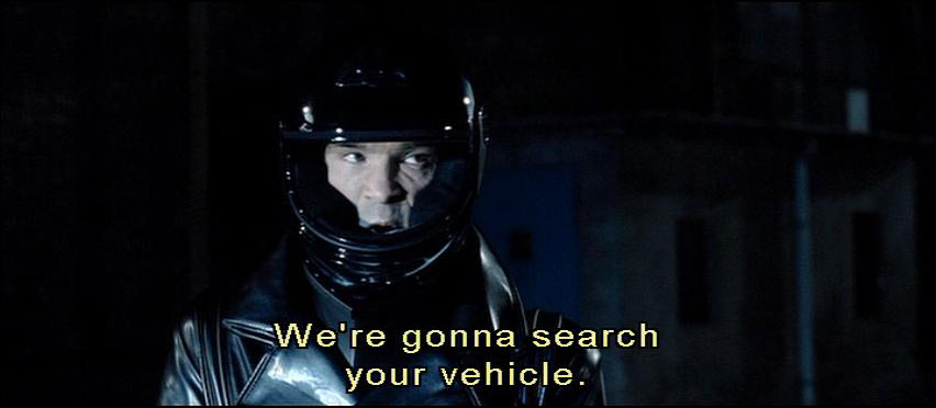 [Preston] I don't have it. [Tetragrammaton] Unidentified individuals are subject to summary destruction. [Preston] You're making a very big mistake. I'm a Grammaton Cleric, First class. [Tetragrammaton] We're gonna search your vehicle. [Preston] No, you're not. There's nothing in it. [Tetragrammaton] Search it!