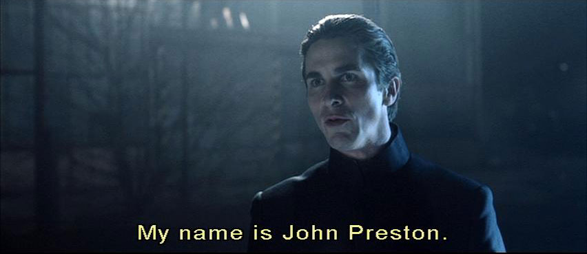 I'm not -- Captain, this is a waste of my time. My name is John Preston. I'm the highest-ranking Cleric of the Tetragramm -- [Tetragrammaton] Wait. Stand off.
