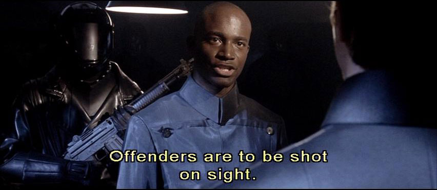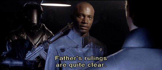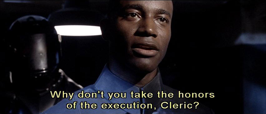 [Preston] These people should be taken for clinical interrogation. [Brandt] Cleric ... Father's rulings are quite clear. Offenders are to be shot on sight.