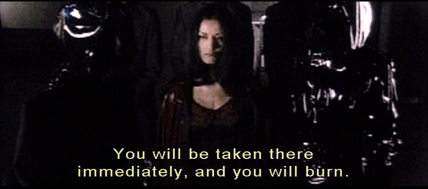 For ceasing your interval, for the crime of feeling, you stand condemned to suffer annihilation in the city furnaces. You will be taken there immediately and you will burn. [Man speaking indistinctly] |
