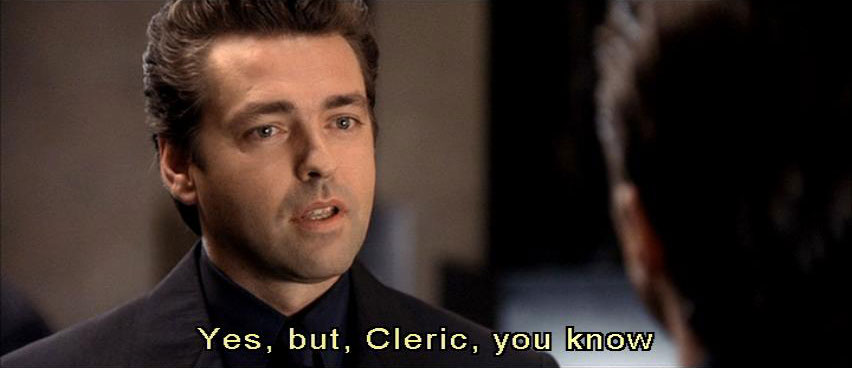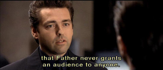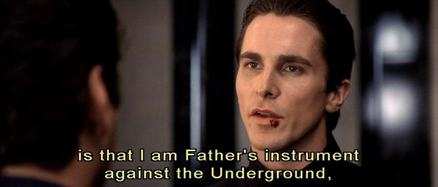 that your colleague is going to his end? [Preston] The only thing that disturbs me, sir, is that I am Father's instrument against the underground, and yet ... I've never had the honor of meeting him. [Dupont] Hmm. Yes, but, Cleric, you know that Father never grants an audience to anyone. [Preston] Even to the man who brings him the resistance? |
