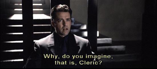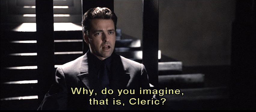[Dupont] Why do you imagine that is, Cleric? [Preston] I'm not sure, Vice-Council. Somehow ... I'm able, on some level, to sense how an offender thinks, to ... put myself in their position. [Dupont] If you had ceased your interval,