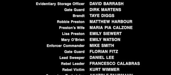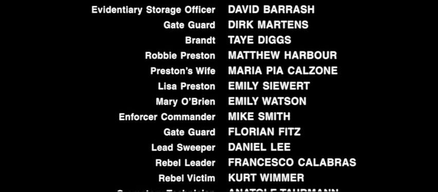 MATTHEW HARBOUR AND WILLIAM FICHTNER CASTING BY JUEL BESTROP, JEANNE MCCARTHY; EUROPEAN CASTING BY LUCINDA SYSON, CDG VISUAL EFFECTS SUPERVISOR: TIM MCGOVERN DIGITAL CITYSCAPES CREATED BY DIGITAL FIREPOWER, INC. A BLUE TULIP PRODUCTION CAST (IN ORDER OF APPEARANCE): Seamus: Dominic Purcell; John Preston: Christian Bale; Partridge: Sean Bean; Officer in Charge: Christian Kahrmann; Chemist: John Keogh; Father: Sean Pertwee; Jurgen: William Fichtner; Dupont: Angus MacFadyen; Evidentiary Storage Officer: David Barrash; Gate Guard: Dirk Martens Brandt: Taye Diggs; Robbie Preston: Matthew Harbour; Preston's Wife: Maria Pia Calzone; Lisa Preston: Emily Siewert; Mary O'Brien: Emily Watson; Enforcer Commander: Mike Smith; Gate Guard: Florian Fitz; Lead Sweeper: Daniel Lee; Rebel Leader: Francesco Calabras; Rebel Victim: Kurt Wimmer Crematory Technician: Anatole Taubmann; Reading Room Proprietor: Brian Connelly; Viviana Preston: Alexa Summer; Dupont's Secretary: Brian Cook; Search Coordinator: Mehmet Kurtulus; Proctor: David Hemmings; Interrogator: Klaus Schindler; Polygraph Technician: Oliver Brandl
