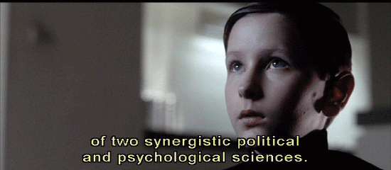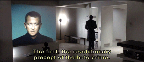 [Father] The later 20th century saw the fortuitous and simultaneous rise of two synergistic political and psychological sciences. The first, the revolutionary precept of the hate crime. [click] [Robbie] John? [Preston] Yes?