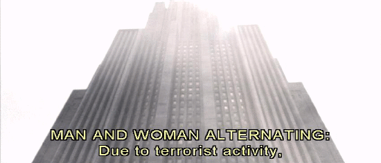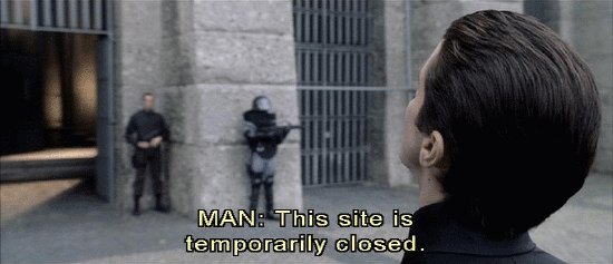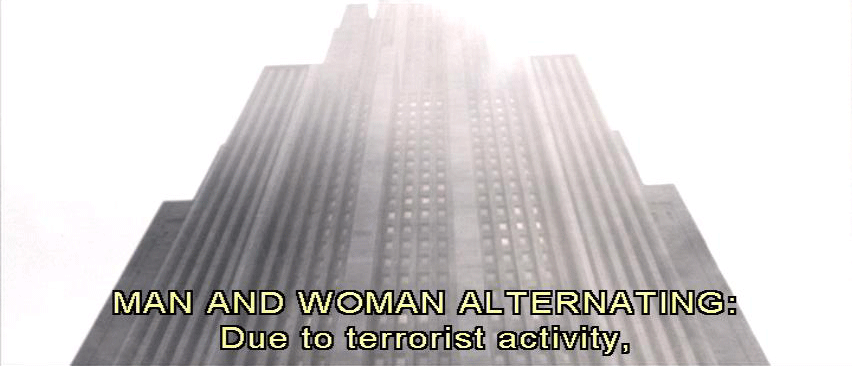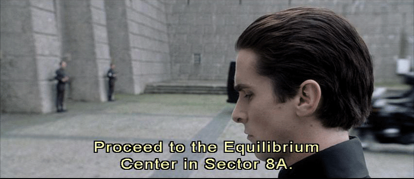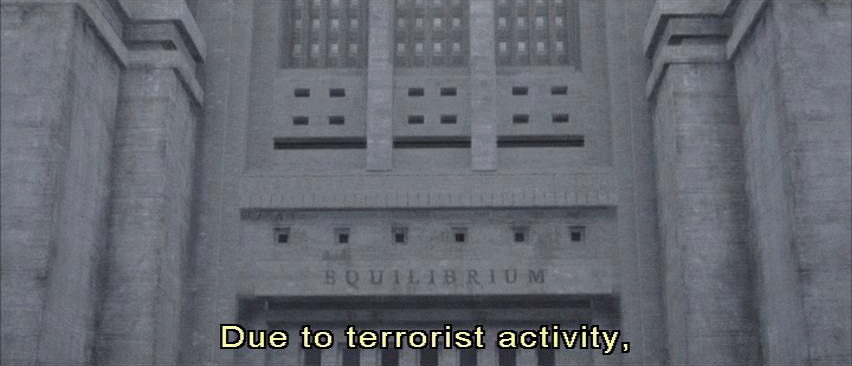 Man and woman alternating: Due to terrorist activity, this site is temporarily closed. Proceed to the Equilibrium center in Sector 8A. Due to terrorist activity, this site is temporarily closed. Man: This site is temporarily closed. Proceed to the Equilibrium Center in Sector 8A.