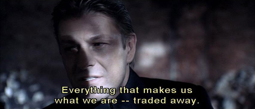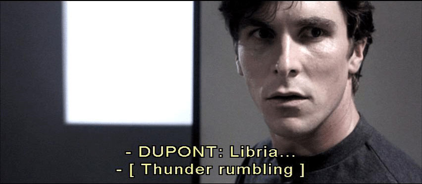 showed up in the records yet. I'm very sorry, Cleric. Nothing has been logged and nothing is pending under that entry. It was an item of evidence brought in personally by Grammaton Errol Partridge. Check again. Sir, Cleric Partridge has not entered anything in for weeks. You're mistaken. It was a book of some kind. Cleric ... [stand scrapes] There's nothing. Thank you. He's been passing through the gate into the nether every night for the last two weeks. We assumed it was enforcement-related. [motor whirs] [wind blowing] [footsteps] You always knew. "But I, being poor ... have only my dreams. I have spread my dreams under your feet. Tread softly ... because you tread on my dreams." I assume you dream, Preston. I'll do what I can to see they go easy on you. We both know ... they never go easy. Then I'm sorry. No, you're not. You don't even know the meaning. It's just a ... vestigial word for a feeling you've never felt. Don't you see, Preston? It's gone. Everything that makes us what we are -- traded away. There's no war. No murder. What is it you think we do? No. You've been with me. You've seen how it can be -- the jealousy, the rage. A heavy cost. I'd pay it gladly. [gun cocks] Don't. [clicks] [gun cocks] [casing rattles] [wind blowing] [footsteps] You and your partner were close? I hope you're as pleased to be assigned to me as I am the placement. I was told this would be a career-making advancement. I'm like you, Cleric -- intuitive. Sometimes I know when a person's feeling before they know it themselves. Cleric ... I can only hope one day to be as ... uncompromising as you. Good night. The later 20th century saw the fortuitous and simultaneous rise of two synergistic political and psychological sciences. The first, the revolutionary precept of the hate crime. [click] John? Yes? I saw Robbie Taylor crying today. He didn't know, but I saw. Do you think I should report him? Unquestionably. [click] ... a single inescapable fact -- that mankind united with infinitely greater purpose in pursuit of war ... than he ever did in pursuit of peace. Partridge: "But I, being poor ... have only my dreams. I have spread my dreams under your feet. Tread softly ... because you tread on my dreams." Don't move! Don't move! Comply! Comply! Stop! Stop where you are! Get down! Get down! [crackling] [grunts] Don't shoot. This is a lawful entry. We have a warrant for your wife's arrest. She's charged with sense offense. [gasps] Hey! Get her! Ger her off him now! Remember me. Dupont: LIBRIA ... [Thunder rumbling] Awake. Awaken to triumph again in the face of yet another day, another step in our unified march into the unwavering purpose ... [thunder rumbles] [voice fades] ... move ahead together into the certainty of our collective destiny. [faucet squeaks] [glass shatters] Robbie: What are you doing? I said, what are you doing? I accidentally dropped my morning interval. I took it out before I brushed my teeth. I never take it out before I brush my teeth. Then you'll go by Equilibrium, log the loss, and get a replacement. Yes. Of course. Your new partner called. He says he'll pick you up at 10:00 for the A.N.R. I hope you don't mind. I took the liberty of telling him you would be at Equilibrium, replacing your dose. No, of course not. That was the right thing to do. [Rattling] Stop that. Man and woman alternating: Due to terrorist activity, this site is temporarily closed. Proceed to the Equilibrium center in Sector 8A. Due to terrorist activity, this site is temporarily closed. Man: This site is temporarily closed. Proceed to the Equilibrium Center in Sector 8A. [horn honking] More than punctual, Cleric. Hop in. [tires screech] How were the lines? I'm surprised you were able to get your interval and get out so quickly. No, they're ... they're fine today. [engine idling] Maybe I'll drop by later, get my interval adjusted. [gun cocks] You expecting resistance? That's something you'll find about me, Cleric. I'm a wary person, cautious by nature. Always expecting the worst. [thud, metal rattles] You can't do this. You cannot do this. Tetragrammaton. There's nothing we can't do. [grunts] How long have you been off the dose? Look at you. [gasps] Look at you! [breathing heavily] Look at you. The mirror's frame is illegal. Destroy it. Man: We have suppression. We're making entry. Man #2: Standard deployment. Collecting catalog. Illegal articles. [glass shatters] You're gonna burn it, aren't you? [bell jingles] Eventually. However, you couldn't have accumulated all this by yourself. It'll all be sorted and examined. We'll discover who your confederates are. Gun! [breathing heavily] We need her. What's your name? O'Brien, Mary. Well, Mary ... you can either wait and tell the technicians at the Palace of Justice ... or you can tell me now. Who are your friends? I'm wondering if you have any idea at all what that word means -- "friend." There's nothing you don't feel? How about guilt? Let me ask you something. [glass clatters] Why are you alive? I'm alive ... I live ... to safeguard the continuity of this great society. To serve Libria. It's circular. You exist to continue your existence. What's the point? What's the point of your existence? To feel. Cause you've never done it, you can never know it. But it's as vital as breath. And without it -- without love, without anger, without sorrow -- breath is just a clock ticking. Then I have no choice but to remand you to the Palace of Justice for processing. Processing. You mean execution, don't you? Processing. The gun katas. Through analysis of thousands of recorded gunfights, the Cleric has determined that the geometric distribution of antagonists in any gun battle is a statistically predictable element. Man: The gun kata treats the gun as a total weapon, each fluid position representing a maximum kill zone, inflicting maximum damage on the maximum number of opponents while keeping the defender clear of the statistically traditional trajectories of return fire. Dupont: B