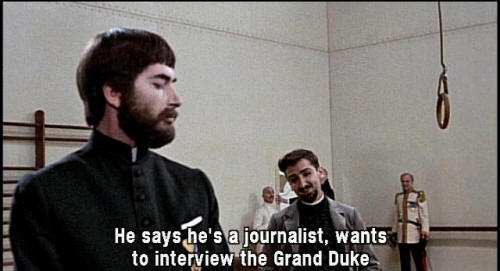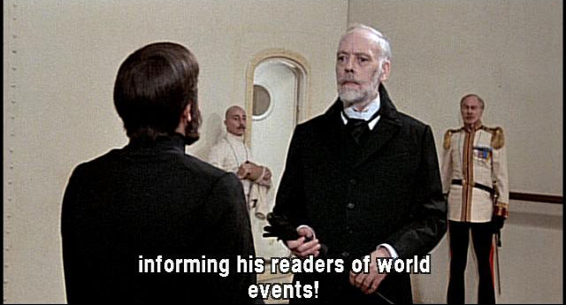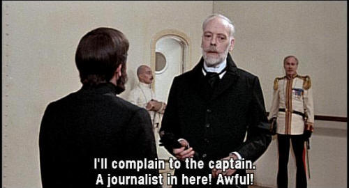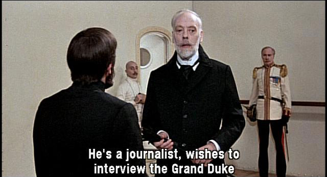 [Translator] He says he's a journalist, wants to interview the Grand Duke. [Orlando] Listen! I'm a respectable passenger aboard this ship. A famous journalist, performing his professional duties, informing his readers of world events! [General] I'll complain to the captain. A journalist in here! Awful! [Count Kunz] He's a journalist, wishes to interview the Grand Duke.