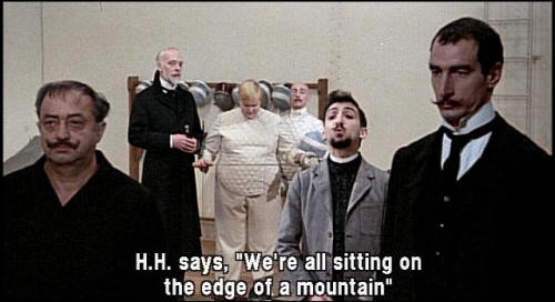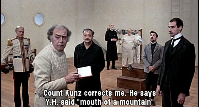 [Translator] H.H. says, "We're all sitting on the edge of a mountain." [Count Kunz] Excuse me for interfering, but the Grand Duke said "the mouth ..." and then the rest. [Translator] Count Kunz corrects me. He says Y.H. said "mouth of a mountain." I thought he said "edge."