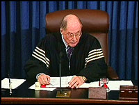 Chief Justice William H. Rehnquist during the impeachment trial of President Clinton in January. (Associated Press) Chief Justice William H. Rehnquist led a sing-along of "Dixie" at a judicial conference in Virginia last month, upsetting some lawyers who view the anthem of the Old South as an expression of fondness for the days of slavery. Rehnquist's sing-along on the annual conference's first night has become a favorite among lawyers and judges who enjoy the chance to mingle with the Supreme Court justice in casual circumstances. More than 100 attend in most years. But some African American lawyers say they avoided the sing-along this year because of their distaste for "Dixie," which was a marching song of Confederate troops during the Civil War and was played at Jefferson Davis's inauguration as Confederate president in 1861. At Rehnquist's sing-along, he stands at the front of the room leading lawyers and judges as they sing from a songbook distributed for the event. The songs are mostly American standards, including "America the Beautiful" and "Anchors Aweigh." The evening typically ends, say those who have attended, with "The Battle Hymn of the Republic," a song written for the Union in the Civil War, and "Dixie." The 4th Circuit Judicial Conference brings together hundreds of federal judges and lawyers from Maryland, Virginia, West Virginia, North Carolina and South Carolina. The gathering alternates between two resorts, the Greenbrier in West Virginia and the Homestead in Hot Springs, Va., where the conference ran this year from June 24 to 26. An invitation said the "Old Fashioned Sing-along" would start just after dinner. "We hope you will plan to join in singing favorite old songs with the Chief Justice!" "Dixie" was penned by a "black-face" singer from the North before the Civil War. But with the opening line "I wish I was in the land of cotton," it has become a racially charged symbol of Old Southern pride. "The song is offensive to African Americans," said Brent O.E. Clinkscale, a black South Carolina lawyer who said he was among several lawyers at the conference who avoided the Rehnquist sing-along because "Dixie" had been sung there in earlier years. "I think it's nostalgic for slavery." White lawyer Zoe Sanders Nettles, also of South Carolina, did attend the sing-along and said she was uncomfortable with the playing of "Dixie." "This hurts people's feelings who are here," Nettles recalled thinking. After the song ended, she approached Rehnquist in the crowded room to register her objections, saying, "I really don't think we should sing 'Dixie.' " After a brief exchange, she said he replied, "Well, okay." Others who have attended the sing-alongs defend the song as a piece of Americana appropriate for a mostly Southern conference. Historians say that it was a favorite of President Abraham Lincoln and that he had it played in the days after Richmond fell in 1865. "I've been to a number of the sing-alongs. I think he's always sung 'Dixie,' " said Richmond lawyer George C. Freeman Jr., who is white. "I think all this stuff about reliving history is overblown. . . . I really think that the past is the past." Rehnquist, 74, who declined to comment for this article yesterday, is known for his fondness for singing and songs. He adorns his robes with gold stripes inspired by Gilbert and Sullivan operetta. He once borrowed the words of a popular song in writing a memo to fellow justices: "Accentuate the positive/Eliminate the negative/Latch on to the affirmative/Don't mess with Mr. In Between." Rehnquist has been involved in another dispute over symbols, resisting calls for the Supreme Court's annual Christmas Party to be renamed a "Holiday Party." He also leads the singing of several Christmas carols and has a 25-foot tree erected at the court. Battles over Confederate symbols have become common in the South. Virginia is replacing its former state song, "Carry Me Back to Old Virginny," because former Gov. L. Douglas Wilder, the nation's first elected black governor, objected to its racial references. Richmond struggled over whether to hang a giant picture of Confederate Gen. Robert E. Lee on a downtown floodwall. And a University of Mississippi band member boycotted "Dixie" at football games in 1993. "Both the battle flag of the Confederacy and 'Dixie' gained a racist cast to them as they were taken on by segregationists," said Howard L. Sacks, co-author of "Way Up North in Dixie," which said the song may actually have been written by black performers in Ohio. Federal Judge U.W. Clemon of Birmingham, who is African American, said the song "symbolizes a determination to keep things as they were, that is, to keep blacks in a subservient position." Beverly McQueary Smith, the president of the National Bar Association, a group of 18,000 African Americans in the legal profession, said the Supreme Court under Rehnquist has become insensitive to minority concerns. "We would be very, very troubled to learn that the chief justice did that," McQueary Smith said of the "Dixie" sing-along. "To us, that song is a vestige of the badges of slavery." Daniel Decatur Emmett, who performed in the "black face" style later popularized by Al Jolson, is said to have penned the song in 1859. Its lyrics are in the stereotyped voice of African Americans as they supposedly long for a return to plantation life and slavery. Misspellings and ethnic pronunciations of words do not appear in most contemporary versions of the song. "It's for some people like the [Confederate] flag," said David L. Smiley, a North Carolina-based historian of the South. "Either you love it, or it's an insult." © 1999 The Washington Post Company Dixie Sing-along A sing-along last month at a judicial conference in Virginia led by Supreme Court Chief Justice William H. Rehnquist featured the singing of "Dixie," a song some lawyers found offensive.