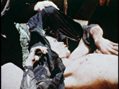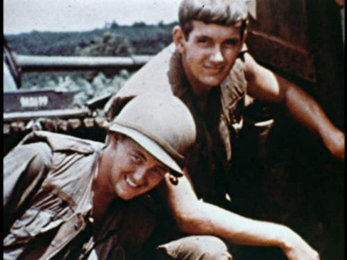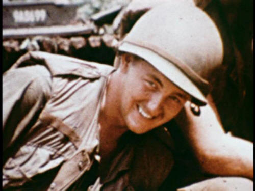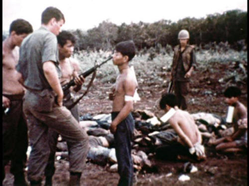 The same POW was forced to sit from probably from 6-8 hours by this pile of bodies in the hot sun. This is a shot of five or six GI's going through the bodies looking for souvenirs. In this picture there is a lieutenant and a captain overlooking what's going on. This is a shot of our interrogator. He took his M-16, he took it and forced it into this prisoner's nose and he twisted it. It's extremely painful. Q. Officers were present at all times? A. Yes, field grade officers were present. And the next slide is a slide of myself. I'm extremely shameful of it. I'm showing it in hopes that none of you people who have never been involved ever let this happen to you. Don't ever let your government do this to you. It's me, holding a dead body, smiling. |