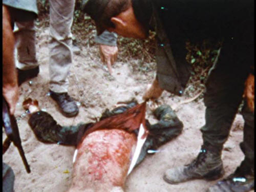 On the way down, because our Company policy was to just keep on firing, I looked out across the field and I spotted a Vietnamese woman, a peasant running away from the ship. I fired a burst of about six or seven rounds into her back before we hit the ground. When I was being questioned as to what happened about two weeks later by a captain in my company, I told him what we did and what I did, and we both had a good laugh about it. That was pretty much company policy. SCOTT CAMILE: I saw a lot of things happening and being done by guys, and I really, like the emotional thing, I mean you see your buddy get killed and it's really emotional. Someone you were really good friends with. Like one minute he's telling you, "I got a letter from my girl, and I'm really happy, and I can't wait to see her, and she's going to send me some pictures she's taken. She's getting her girlfriend to take some nice polaroid pictures of me," you know. And then you go out, and he gets shot in the head, and it was really hard for you to realize that five minutes ago he was your friend and now he's dead. And you put him on the helicopter and you just make believe that he went home. You try not to think he was killed. And then you say, "I'm gonna get the gooks for it." And you just take it out on all the gooks. And it got to be where, it was like someone would say, "Okay, you come stay on my farm, and you can go hunting every day for free and I'll give you all the ammo you want and you can hunt and there's no limit, and you can all go out together and just hunt. And that's what this was like. It was a hunting trip. And the more people we killed, the happier our officers were, you know. |