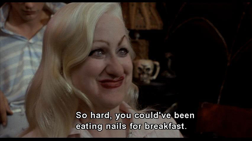 So hard, you could've been eating nails for breakfast. But that's the way a woman's got to be these days. HATCHET: I'd kick a Square's ass for you in a minute, Mrs. Rickettes. RAMONA: Oh, this is the best gang my grandson could ever have. |