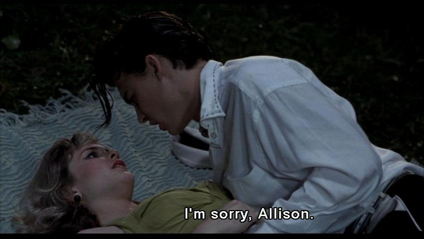 WADE: I'm sorry, Allison. It's just that you are so beautiful. ALLISON: I want to let you, but I can't. For my parents' sake. Cry-Baby, they're both dead. I'm an orphan. |