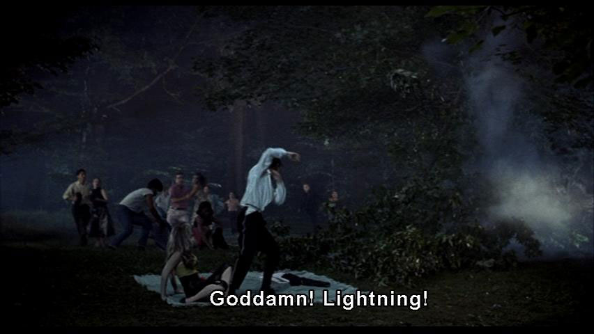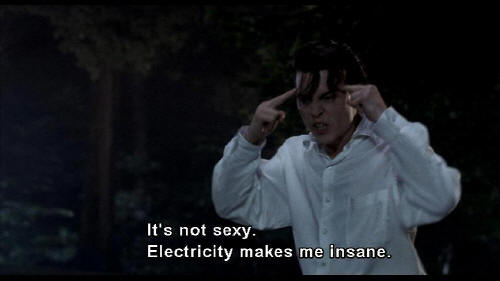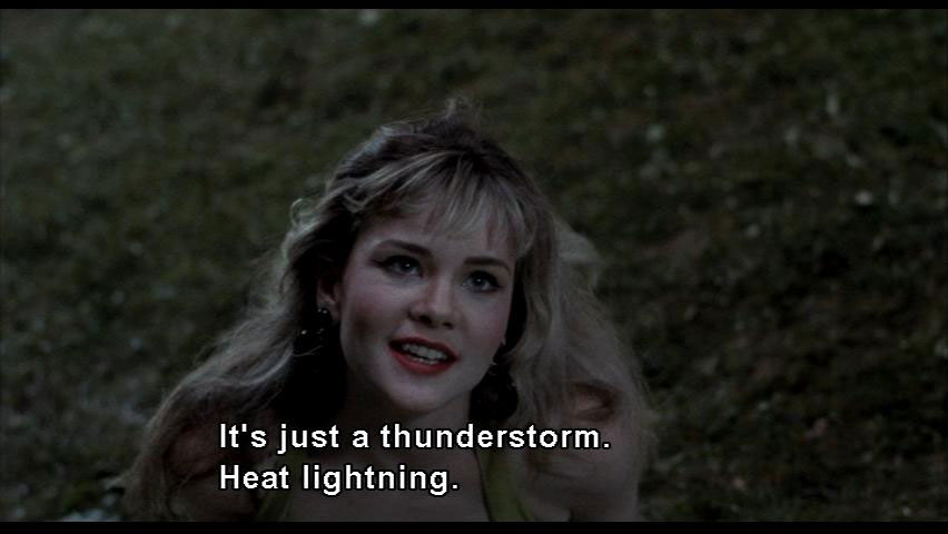 WADE: Goddamn! Lightning! ALLISON: What's the matter, Cry-Baby? WADE: Everything is the matter. ALLISON: It's just a thunderstorm. Heat lightning. It's sexy. WADE: It's not sexy. Electricity makes me insane. ALLISON: Why, Cry-Baby? Why? |