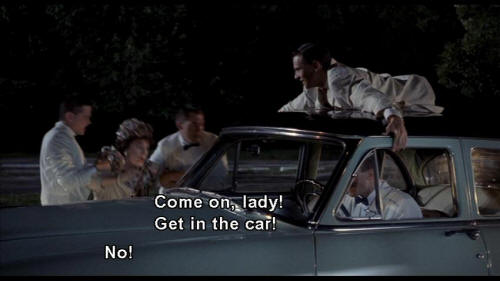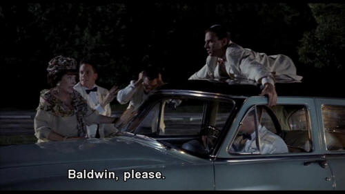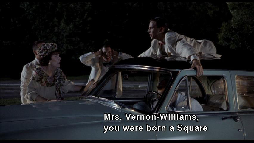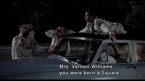 MRS. VERNON WILLIAMS: Baldwin, please. Be a gentleman and call off this race, it's too dangerous. BALDWIN: Mrs. Vernon-Williams, you were born a Square and you're gonna die a Square. You're coming with me. BOY: Come on, lady! Get in the car! MRS. VERNON WILLIAMS: No! |