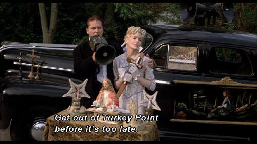 MILTON'S FATHER: Teenagers everywhere repent! Let Jesus Christ be your gang leader! Get out of Turkey Point before it's too late TOE-JOE: Oh, take it easy, honey. I'm not getting any younger here, you know. Oh! That is what I call a real great shape. |