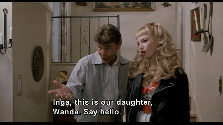 Well, I was out for a little fun [PRISONERS] [singing] Stuck in a cage with a teenage rage [WADE] [singing] I don't want to be doing time for being young [GUARD] [putting handcuffs on Wade] *** [people chattering] [I'm a Bad Bad Girl by Little Esther playing] I'm a bad girl [WANDA] Who the hell is this? [MAGGIE]: This is Inga. She's from Sweden. And she's going to be staying with us for a while. [HECTOR] Inga, this is our daughter, Wanda. Say hello. [INGA] Ya? [WANDA] [scoffs] I'm blowing this joint. [WANDA'S FATHER] Well, Inga doesn't understand English very well. [INGA] Ya? [MAGGIE]: Say hello to our daughter. [INGA] Ya? [HECTOR] Uh, h-honey, why don't you come over and sit down? Look at all the wonderful presents [MAGGIE]: Let's all put on a folk hat [HECTOR] Do we have a surprise for you. Don't we, Meg? [MAGGIE]: We sure do. Wanda, honey, you're going to Sweden, [WANDA] You mean you swapped me? For a milkmaid? [HECTOR] Oh, honey, Inga's mater and pater will treat you just like one of the family. Ya, Inga? [INGA] Ya. Ya, Ya. [WANDA] You want to learn about America, Inga? We like hot boys. [MAGGIE] Wanda honey, want some Ovaltine? [INGA] Ya. Ya, Ya. [WANDA] Yeah, I'm just a bebop baby. *** [people clamoring] [Nosey Joe by Bullmoose Jackson playing]