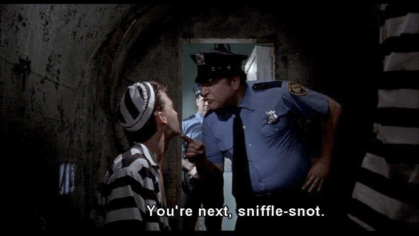 I'm just out for a little fun [PRISONERS] [hollering] [WADE] [singing] What do I do, who do I thank? [PRISONERS] [singing] What can I do? What can I do? [WADE] [singing] To get me out of this stinking tank [PRISONERS] [singing] Stinking tank; Stinking tank [WADE] [singing] It's heartbreaking to be this age [PRISONERS] [singing] Stuck in a cage; Stuck in a cage [WADE] [singing] Locked in the prison of teenage rage [PRISONERS] [singing] Stuck in a cage with a teenage rage [PRISONERS] [clamoring] [WADE] [singing]