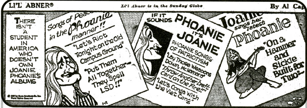 QUESTION, THEY EXPECT A REPLY! DOESN'T MATTER IF YOU'RE FIXIN' TO DIE. Folk singer Joan Baez, a distinguished critic of the Sturm and Drang in Southeast Asia, survived the CHAOS backlash. Unlike many of the musicians who fell under the heel of the mammoth inter-agency operation, she fully understood that political assassination could be her reward for openly castigating military-industrial masters of war. Her close friend Martin Luther King, Jr. climbed to the "mountaintop." She met him on the descent. The world's most honored civil rights leader explained to Baez and a group of activist supporters before delivering the famed speech how he came to scale the "mountaintop." "[He] told us how it happened. It was when he was in solitary confinement in Alabama or someplace. [The police] had dumped him in the hole, and it was black, he couldn't see And they shoved food into the room, but he was afraid to eat it. Starving, afraid -- he said he got on his knees for hours. 'And when I stood up,' he said, 'it didn't matter anymore.'" King's entourage hid their pain "when we knew what he meant -- we knew he was going to die. And he was ready to die, and he was ready to make his commitment about Vietnam -- which is why he died. 'I've been to the mountaintop, and I've seen the promised land, and it doesn't matter anymore.'" [1] King's example left Baez with a personal and highly instructive vantage point to view the pathological drives of the intelligence sector's bloodhounds, but she already had a jump on most activists -- she was to the national security state born. Baez wrote in a memoir, And a Voice to Sing With (1987), of her childhood and her father, a "bright young Stanford scientist" who settled in Los Alamos, New Mexico, the incubation chamber of the atomic bomb. Albert Baez "recognized the potential destructive power of the unleashed atom even in those early days. So he took a job as a research physicist at Cornell University in Ithaca, New York: Cornell was the home base of the CIA's mind control experiments, and Joan Baez is a survivor of ritual child abuse and a multiple personality, according to letters she has written to researchers and other survivors, a common cover for trauma-based mind control programming (she has sung about it: "I'm paying for protection/Smoking out the truth/Chasing recollections/Nailing down the proof ..." [2]) Baez entertained no delusions about the CIA. In San Francisco, she once promoted State of Seige, a film, she said later, that "exposed, among other things, the corrupt element in the AID program which funded the teaching of torture techniques in Latin America. We solicited signatures against the use of torture." She informed these signatories, "Torture was more prevalent than it had been since the middle ages, thus the danger was its common use as government policy," and, "though at one remove, the hands of the US government were far from clean." [3] The psychological cost of ritual abuse/mind control experimentation as a child, and decades of civil rights activism, has been years of intensive therapy to confront her "inner demons," her fears, insomnias, panic attacks, phobias, and anxieties. Therapists kept Baez "glued together, to get me to the next gig, or to the next march." [4] Joan's father, a Quaker by religious conversion, "was invited to become Head of Operations Research at Cornell." This position and a security pass would almost certainly bring him into contact with the CIA's Human Ecology Fund, the contract base for all classified academic mind control studies sequestered behind the privet fences of Ivy League campuses across the country. "Exactly what the job entailed was classified information," Baez recalls, but her father was "offered a three-week cruise on an aircraft carrier as an introduction to the project and promised a huge salary. As it turned out, he would be overseeing Project Portrex, a vast amphibious exercise which among other things involved testing fighter jets, then a relatively new phenomenon. Millions of dollars would be poured into the project, about which he was to know little and say less." [5] After high school, her father moved on to MIT, another fount of classified military research. [6] At the age of ten, she lived in Baghdad, Iraq with her family. Upon their return to the U.S., the Baez family moved to California. LI'L ABNER, BY AL CAPP: THERE ISN'T A STUDENT IN AMERICA WHO DOESN'T OWN JOANIE PHOANIE'S ALBUMS: SONGS OF PEACE IN THE PHOANIE MANNER!! "LET'S RIOT TONIGHT ON THE OLD CAMPUS GROUND." "PUT THEM ALL TOGETHER -- THEY SPELL LSD!!" IF IT SOUNDS PHOANIE IT'S JOANIE. PHOANIE SONGS OF PATRIOTISM. "LAY THOSE WEAPONS DOWN, MCNAMARA." "THROW ANOTHER DRAFT CARD ON THE FIRE!!" "LET'S CONGA WITH THE VIET CONG." JOANIE SINGS HER LATEST PHOANIE. "ON A HAMMER AND SICKLE BUILT FOR TWO" -- SOME RIGHT-WINGERS FOUND THE MUSIC OF JOAN BAEZ LESS THAN INSPIRATIONAL She was not buried by CHAOS, but she lived under its intolerant eye and it could silence her: "An American," the New York Times reported on February 21, 1967, "identifying himself as Harold Cooper, a CIA man, had ordered the Japanese interpreter, Ichiro Takasaki, to substitute an innocuous translation in Japanese for Miss Baez' remarks in English on Vietnam and Nagasaki's atom bomb survivors." Cooper asked Takasaki to revise political statements made by the folk singer, and warned, "If you don't cooperate, you will have trouble in your work in the future." The interpreter cooperated and mistranslated her statements. "It was a most strange case," Takasaki told reporters "I knew that Miss Baez was a marked person who was opposed to the Vietnam War and who had been tacitly boycotted by the broadcasting companies in the United States. American friends also repeatedly advised me not to take on the job, but I took it on as a business proposition, since the Japanese fans were coming not to hear her political statements, but her music. I met Mr. Cooper once in the presence o