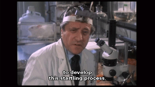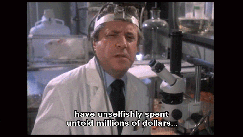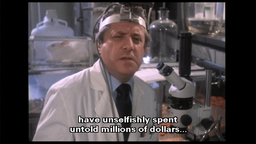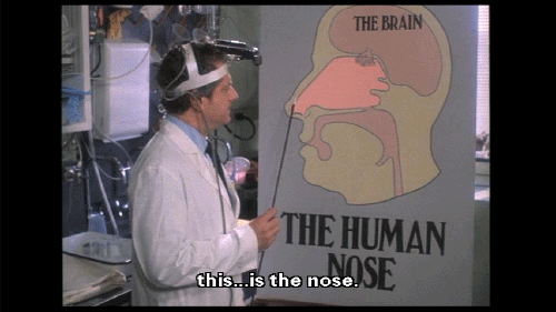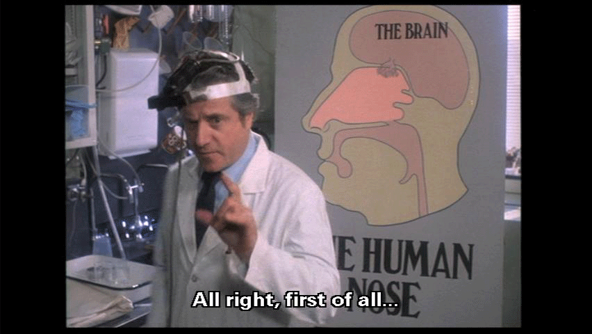 have unselfishly spent untold millions of dollars ... to develop this startling process. And I have been locked away for many years ... in the laboratory ... experimenting with this mind-boggling project. I would like to share with you some of my research. All right, first of all ... this ... is the nose.