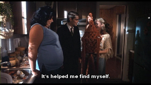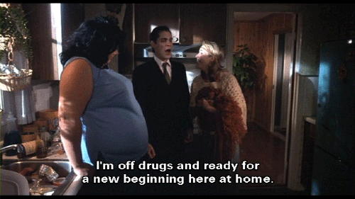 [Lu-Lu Fishpaw] Forgive me for being so awful, but I've changed. Bo-Bo's dead, and I've had a miscarriage. [Derek Fishpaw] That's awful. [Lu-Lu Fishpaw] But I've discovered macrame! It's helped me find myself. I'm gentler now and more creative. [Dexter Fishpaw] I'm an artist now, too, Lu-Lu. I'm off drugs and ready for a new beginning here at home. [Francine Fishpaw] Oh, you see, children?