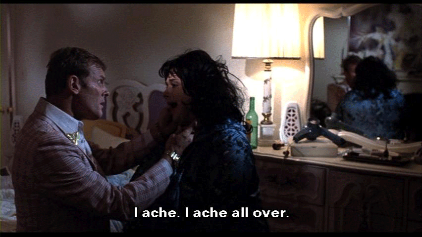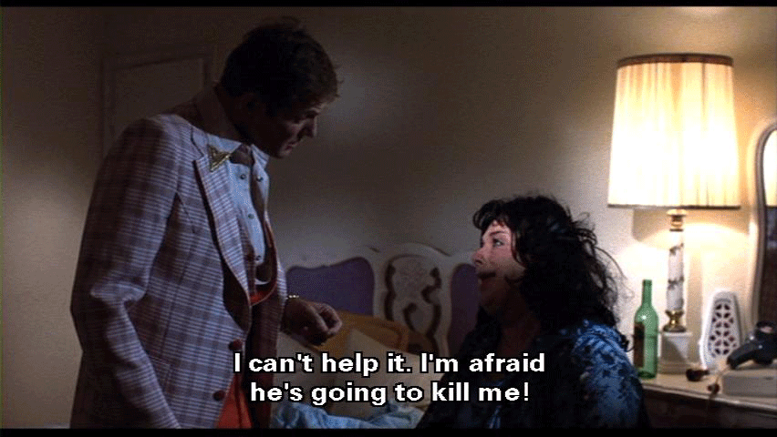It's just that my husband's been harassing me every day. I can't help it. I'm afraid he's going to kill me! I crave liquor right this minute. [Todd Tomorrow] Easy does it, baby. One day at a time. [Francine Fishpaw] I ache. I ache all over. [Todd Tomorrow] Let me kiss away your D.T.s, honey.
