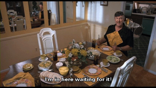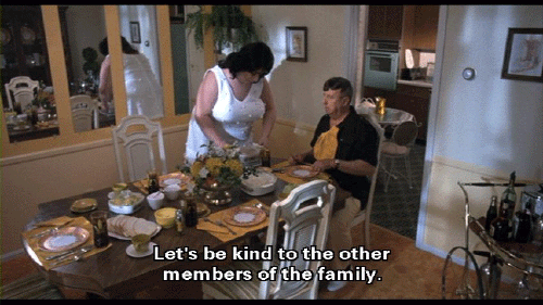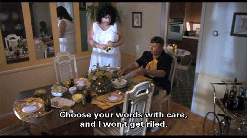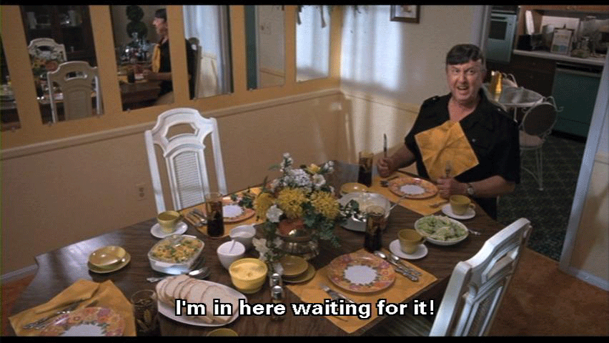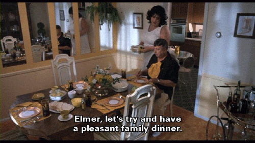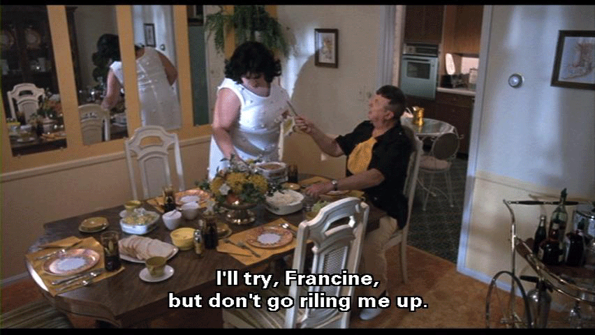 [Elmer Fishpaw] I'm in here waiting for it! [Francine Fishpaw] Elmer, let's try and have a pleasant family dinner. Let's be kind to the other members of the family. [Elmer Fishpaw] I'll try, Francine, but don't go riling me up. Choose your words with care, and I won't get riled.