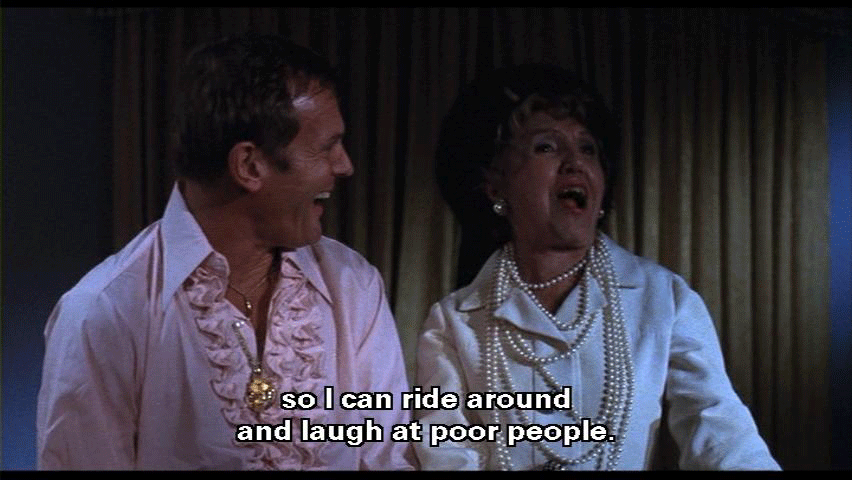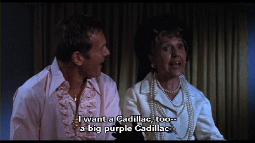 [Francine Fishpaw] [Making Ape Sounds] [La Rue] Let's move to Miami. Finally, I can get my face-lift. I want a Cadillac, too -- a big purple Cadillac -- so I can ride around and laugh at poor people. [Francine Fishpaw] [Making Chicken Sounds]