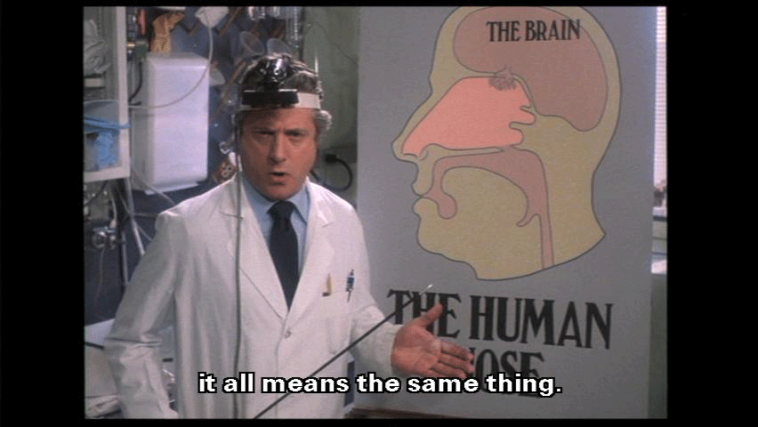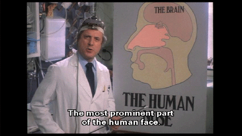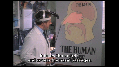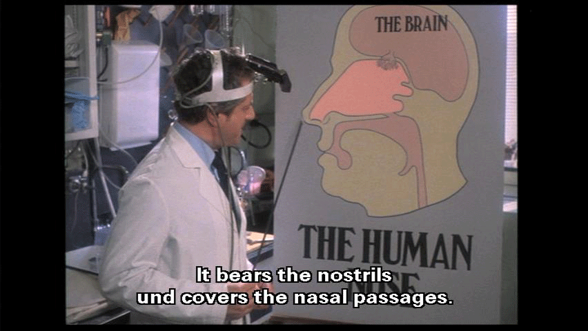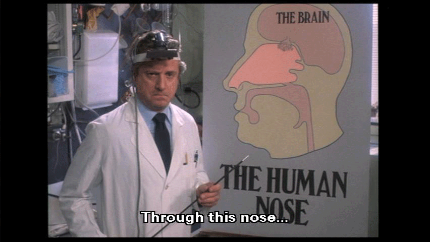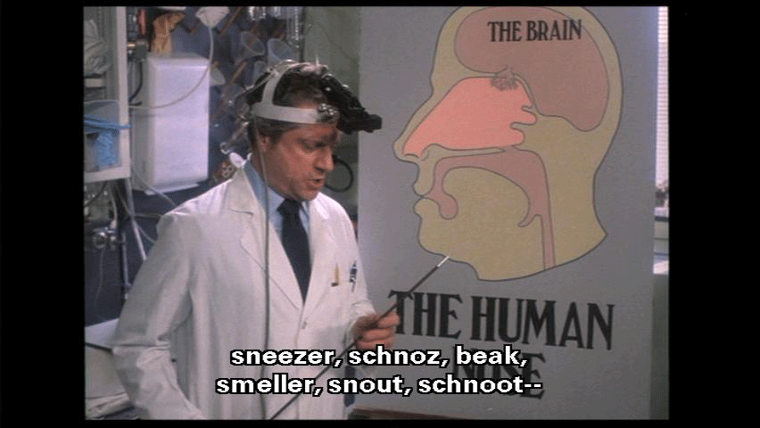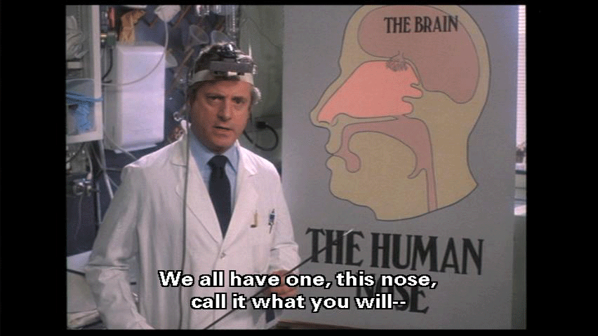 The most prominent part of the human face. It bears the nostrils und covers the nasal passages. We all have one, this nose, call it what you will -- sneezer, schnoz, beak, smeller, snout, schnoot -- it all means the same thing. Through this nose ... comes some of life's most rewarding sensations ...