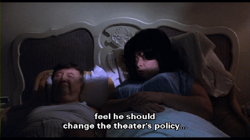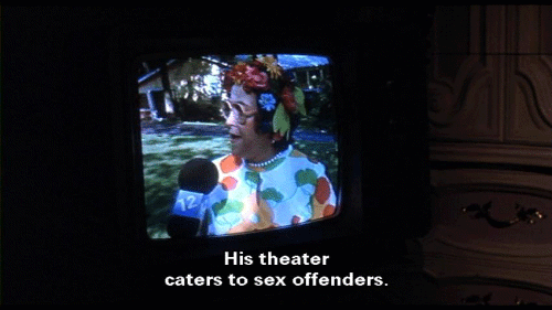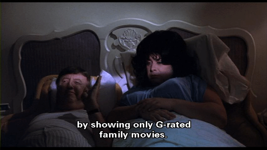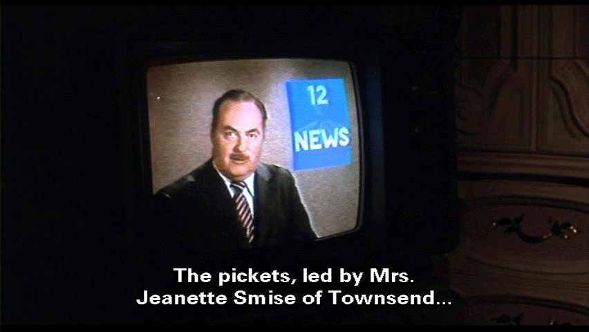 One-three-five-nine, G-rated movies are mighty fine! [TV Reporter] The pickets, led by Mrs. Jeanette Smise of Townsend ... feel he should change the theater's policy ... by showing only G-rated family movies. [Jeannette Smise] His theater caters to sex offenders. [TV Reporter] We visited the Charles Art Theater today ... but were unable to find a ticket buyer ... willing to be interviewed on camera.