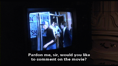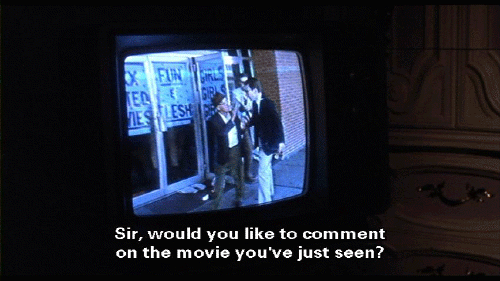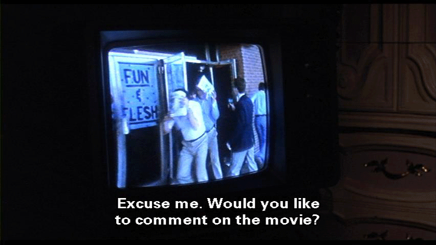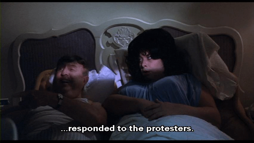 [Reporter] Sir, would you like to comment on the movie you've just seen? Excuse me, sir. Pardon me. Would you like to comment on the movie? Excuse me, sir. Pardon me, sir, would -- Pardon me, sir, would you like to comment on the movie? [TV Reporter] Mr. Fishpaw when contacted by Channel 12 News ... [Elmer Fishpaw] Here I am! [TV Reporter] ... responded to the protesters. [Elmer Fishpaw] I think that my theater helps stop rape.