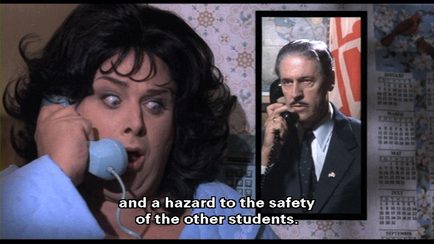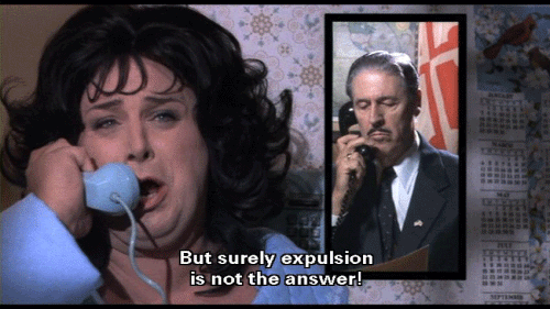 But surely expulsion is not the answer! [Mr. Kirk] I'm afraid expulsion is the only answer. It is the opinion of the entire staff ... that Dexter is criminally insane ... and a hazard to the safety of the other students. We have no choice. I'm sorry. Good day, Mrs. Fishpaw.