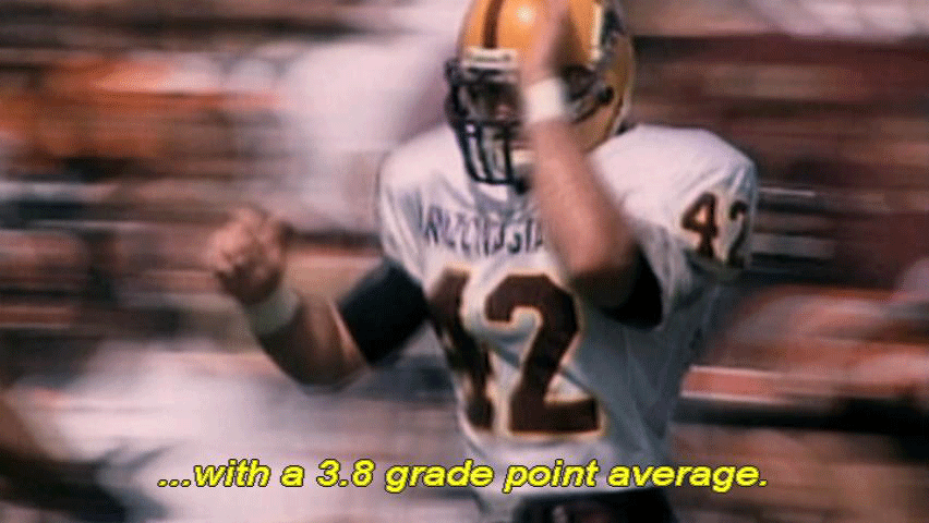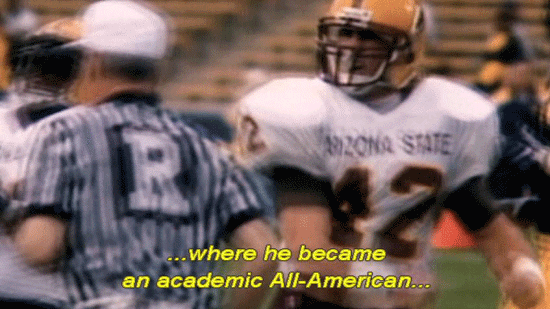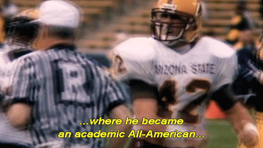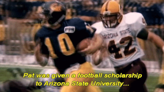 If you're gonna do that kind of stuff, do it behind my back. [Narrator] Pat was given a football scholarship to Arizona State University ... ... where he became an academic All-American ... ... with a 3.8 grade point average. |
