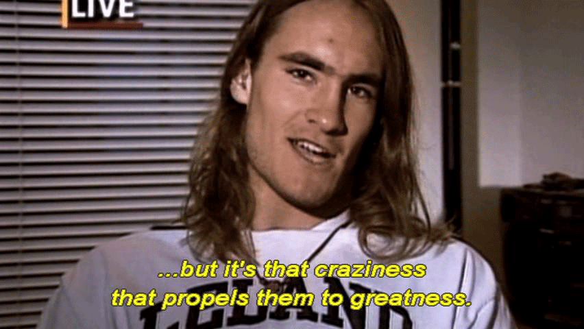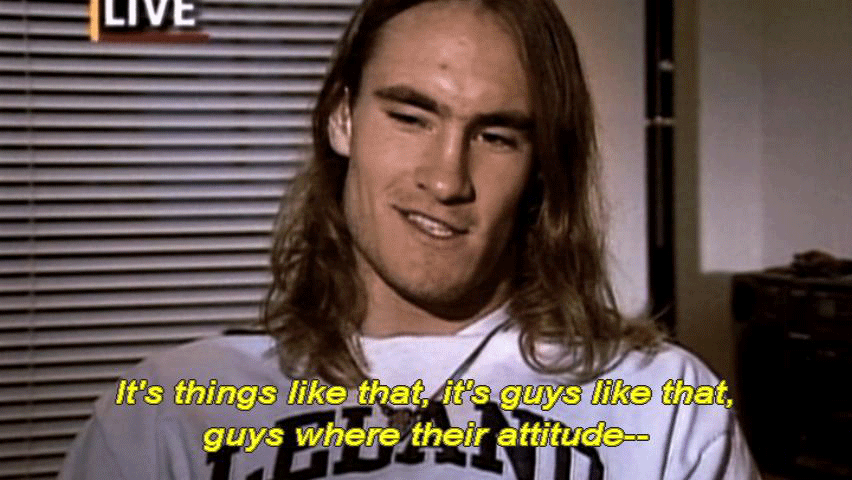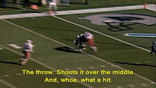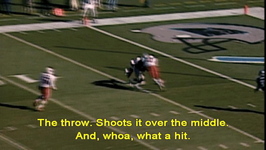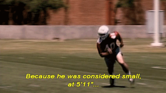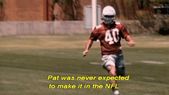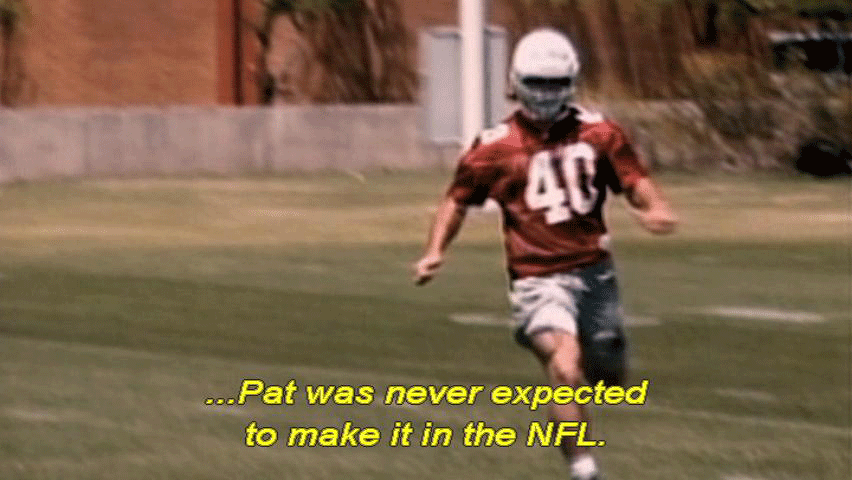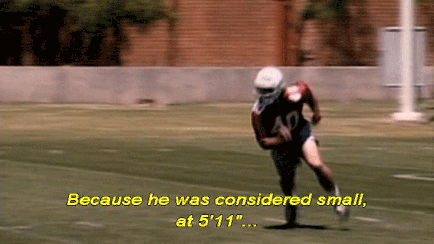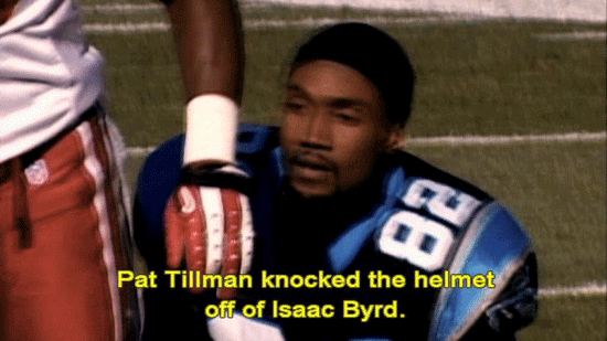 It's things like that, it's guys like that, guys where their attitude -- They're a little bit crazy ... ... but it's that craziness that propels them to greatness. [Sportscaster 1] The throw. Shoots it over the middle. And, whoa, what a hit. Pat Tillman knocked the helmet off of Isaac Byrd. [Sportscaster 2] That was scary. [Sportscaster 1] Oh, my. [Narrator] Because he was considered small, at 5'11" ... ... Pat was never expected to make it in the NFL. |