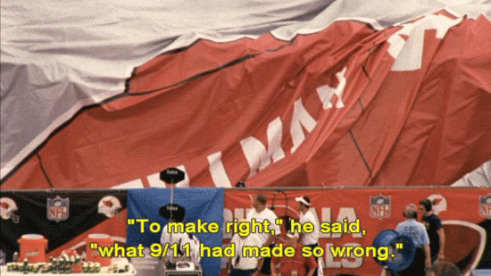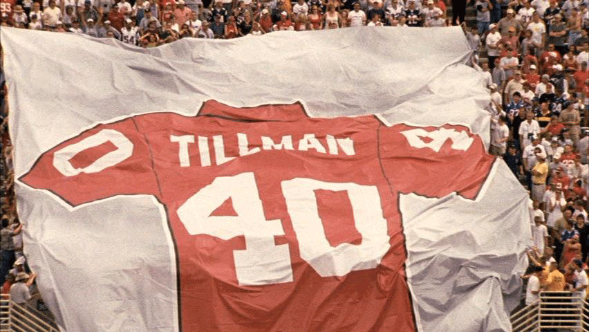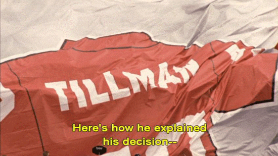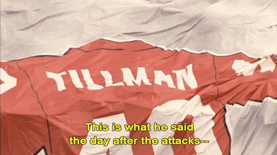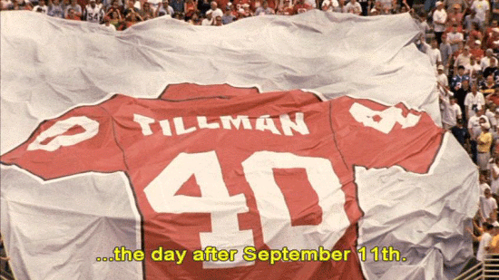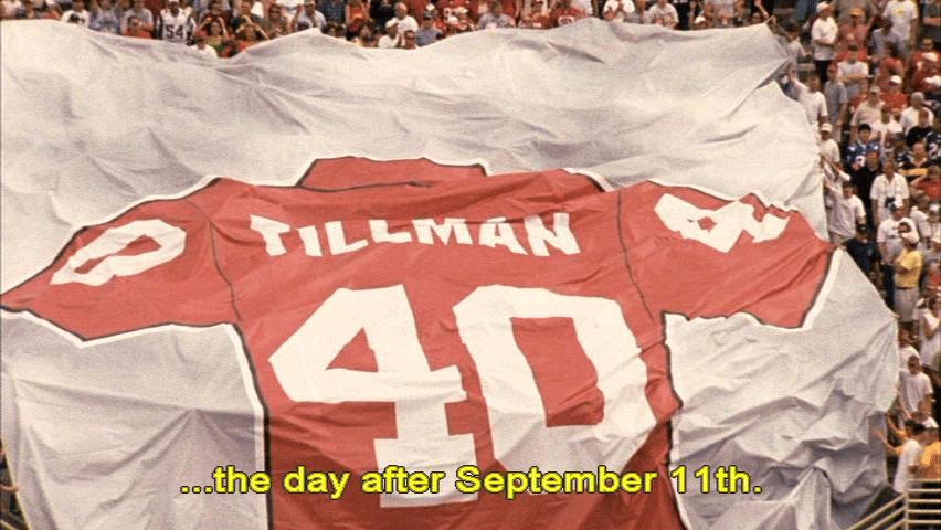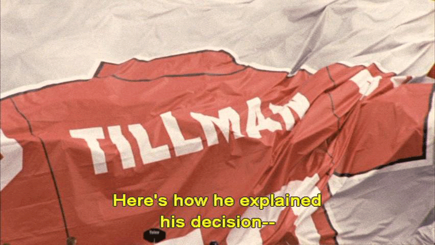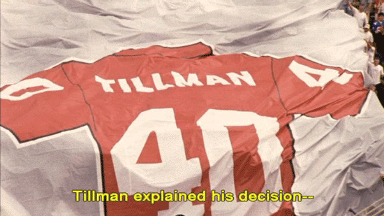 [Newscaster 2] Former safety for the Arizona Cardinals ... ... gave up a multimillion-dollar pro-football deal ... ... the day after September 11th. Tillman explained his decision -- [Newscaster 3] This is what he said the day after the attacks -- [Newscaster 4] Here's how he explained his decision -- [Newscaster 5] "To make right," he said, "what 9/11 had made so wrong." |