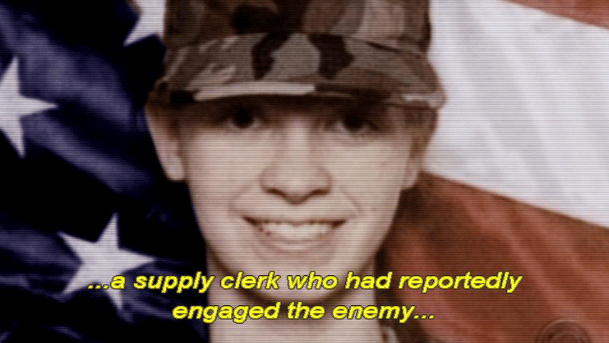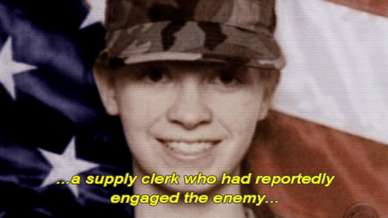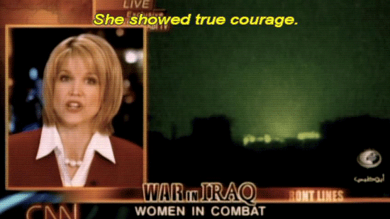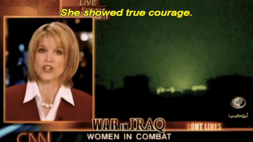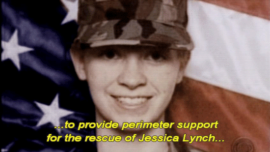 ... to provide perimeter support for the rescue of Jessica Lynch ... ... a supply clerk who had reportedly engaged the enemy ... ... in a fierce firefight before being taken prisoner. [Newscaster 1] She showed true courage. [Newscaster 2] She shot until she ran out of ammunition. |