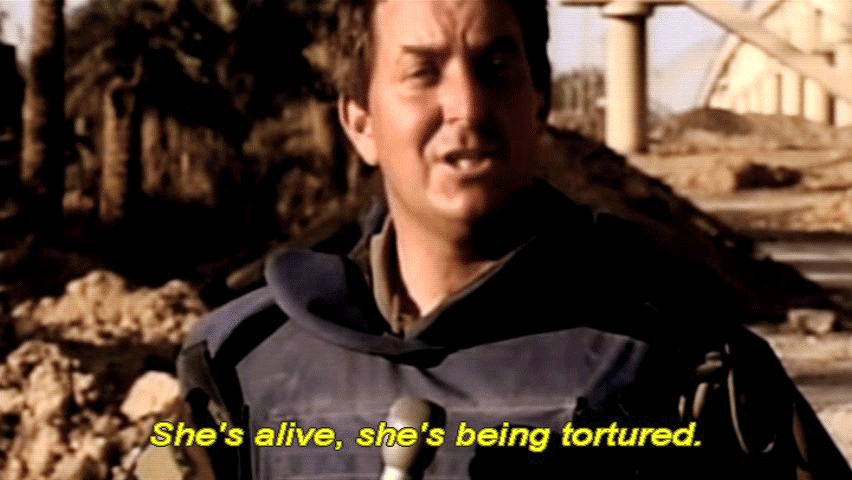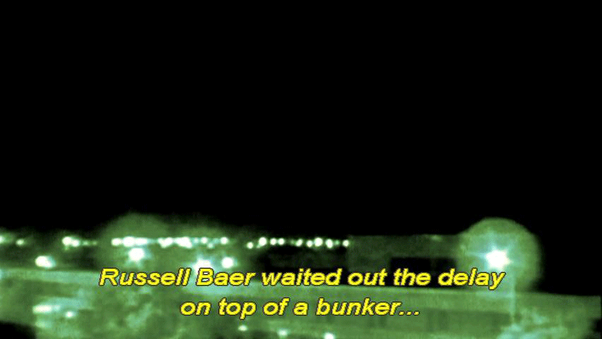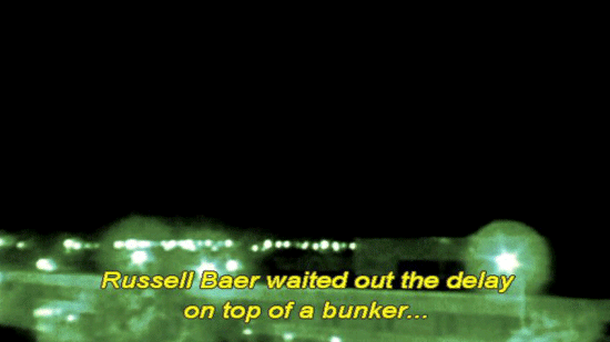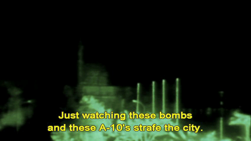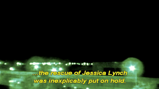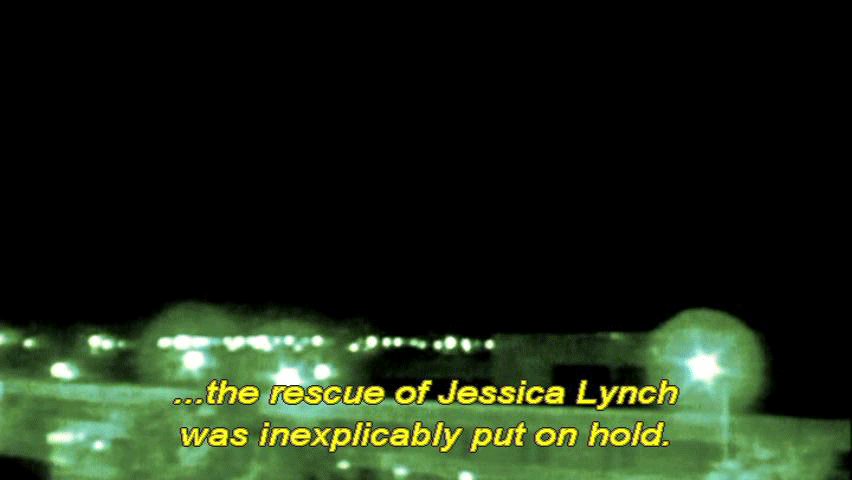 [Newscaster 3] She's alive, she's being tortured. [Narrator] Despite the apparent urgency ... ... the rescue of Jessica Lynch was inexplicably put on hold. Russell Baer waited out the delay on top of a bunker ... ... with Pat and his brother Kevin. [Pfc. Russell Baer, 2/75 Ranger Battalion] Just watching these bombs and these A-10's strafe the city. |
