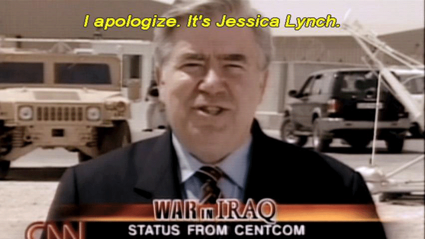 I apologize. It's Jessica Lynch. [Stan Goff, Retired soldier] If you wanna get the public to cosign something ... ... you gotta give them something that they're willing to cosign. It has to be turned into a morality play. [Girl 1] American hero. [Girl 2] American hero. [Stan Goff, Retired soldier] I do not wanna see dead bodies. |