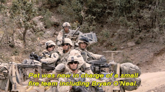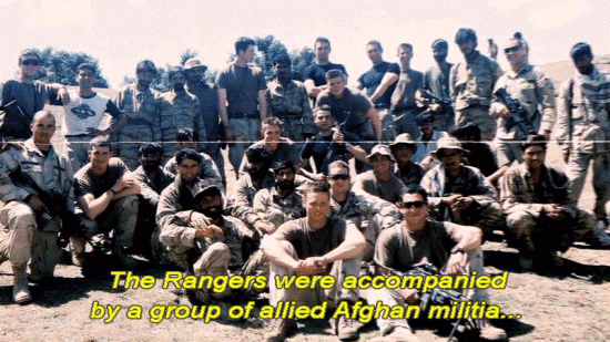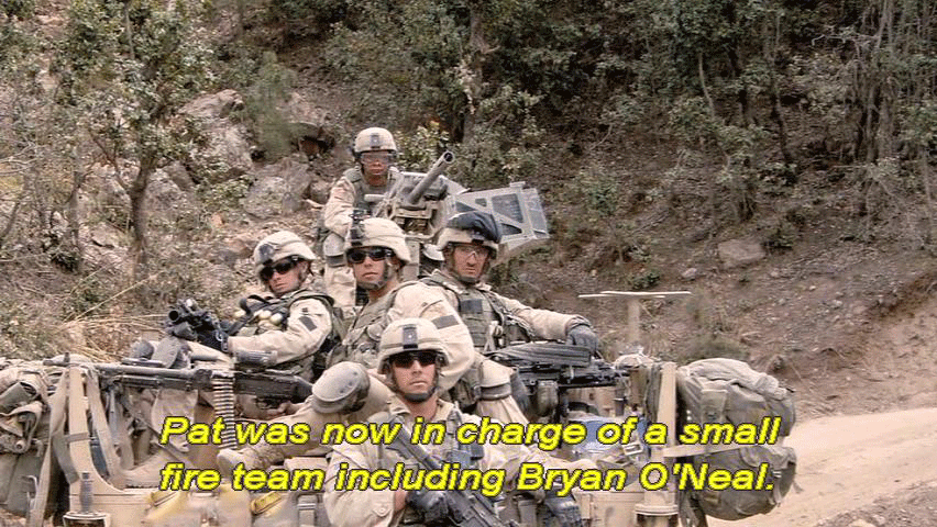 The Rangers were accompanied by a group of allied Afghan militia ... ... known as AMF soldiers. Pat was now in charge of a small fire team including Bryan O'Neal. [Pfc. Bryan O'Neal, 2/75 Ranger Battalion] At that time, I mean, I was still brand-new. |