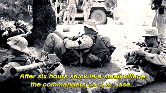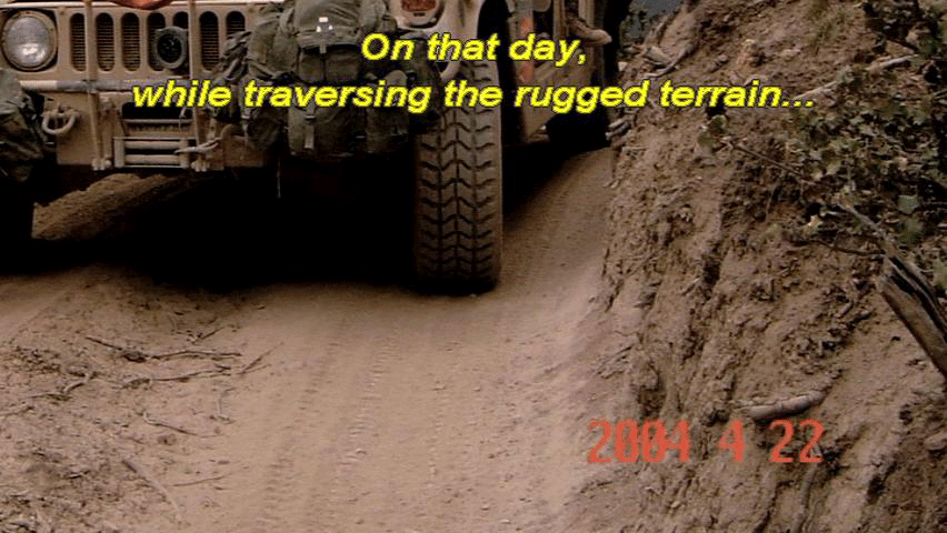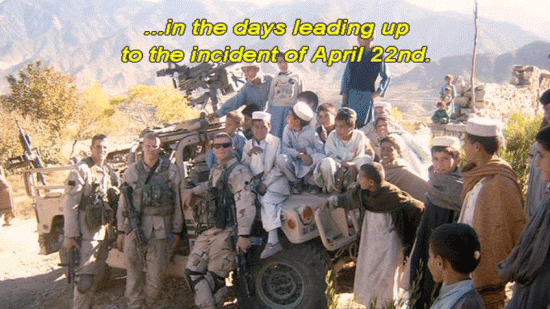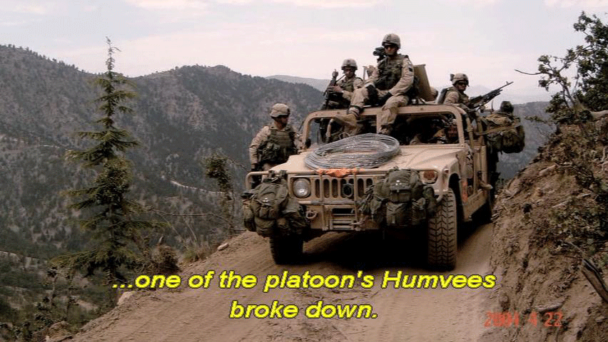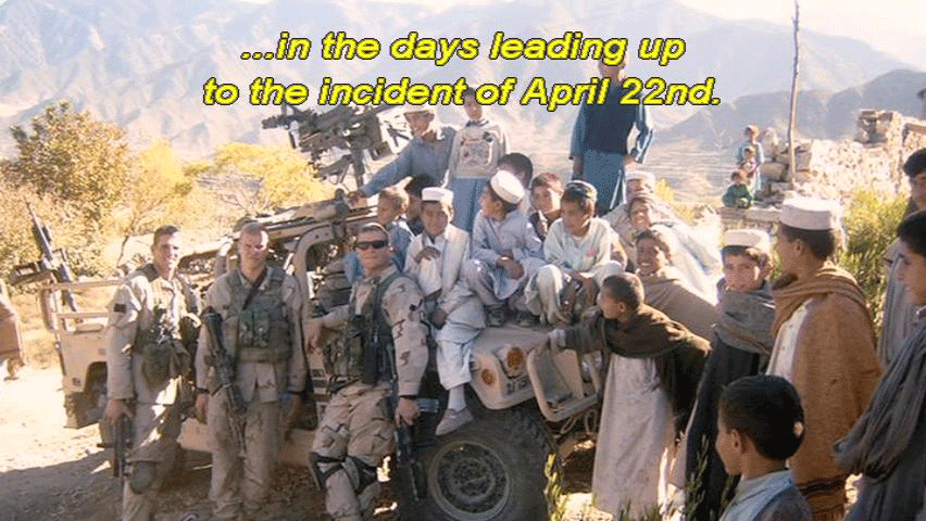 ... in the days leading up to the incident of April 22nd. On that day, while traversing the rugged terrain ... ... one of the platoon's Humvees broke down. After six hours stuck in a small village, the commanders back at base ... |