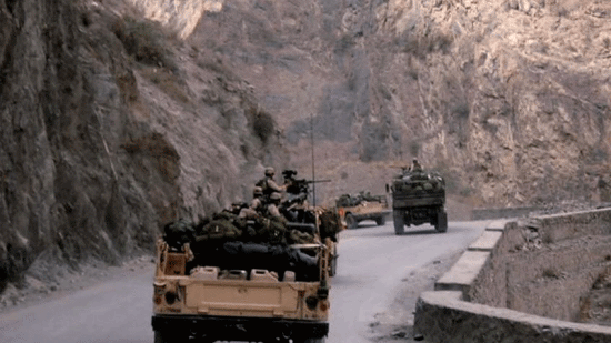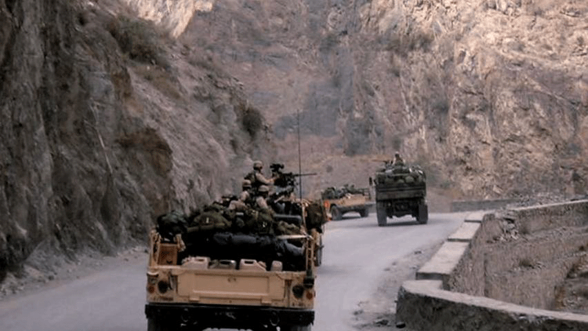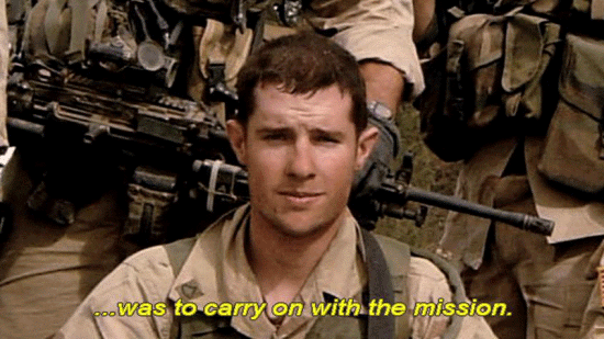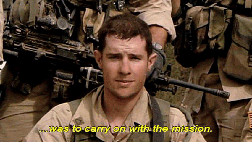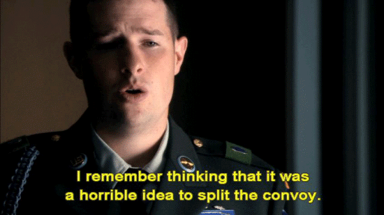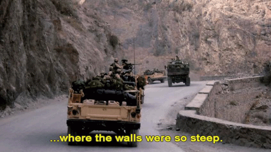 ... was to carry on with the mission. [Pfc. Bryan O'Neal, 2/75 Ranger Battalion] I remember thinking that it was a horrible idea to split the convoy. You know, you're taking half of your firepower away ... ... especially in this area we were going through. As soon as we took off, we basically went into this canyon ... ... where the walls were so steep. |