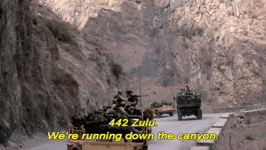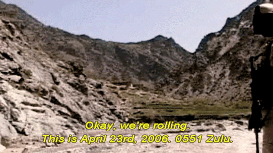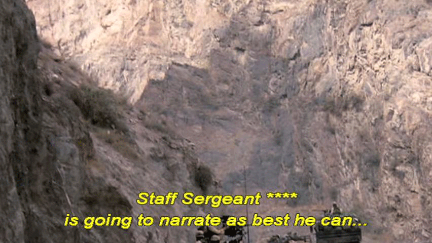 [Investigator] 442 Zulu. We're running down the canyon. Staff Sergeant **** is going to narrate as best he can ... ... his recollection of events passing through this canyon. [Narrator] This video shows the actual canyon where Pat was killed. It was presented to the Tillmans ... ... as part of the military's official explanation of the incident. [Investigator] Okay, we're rolling. This is April 23rd, 2006, 0551 Zulu. |