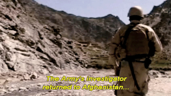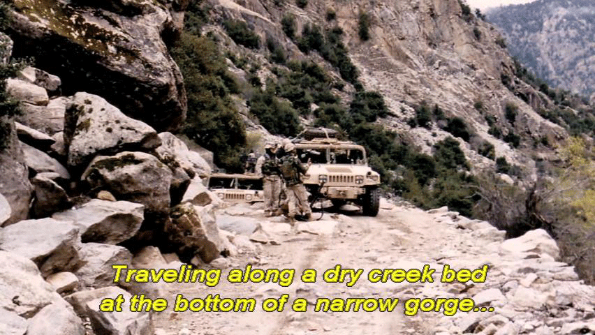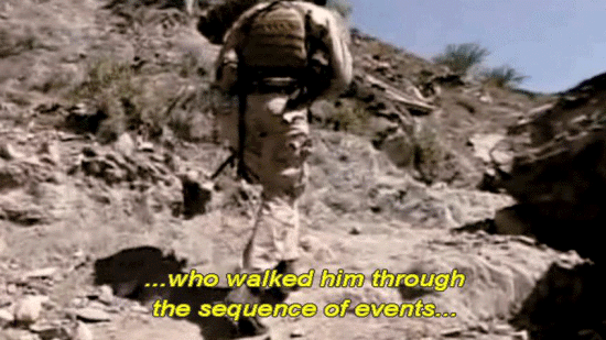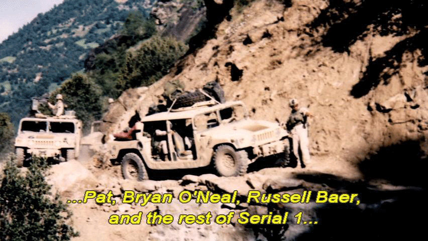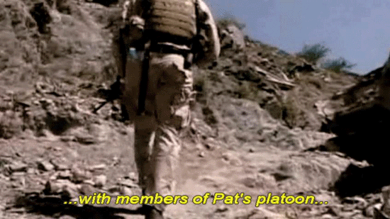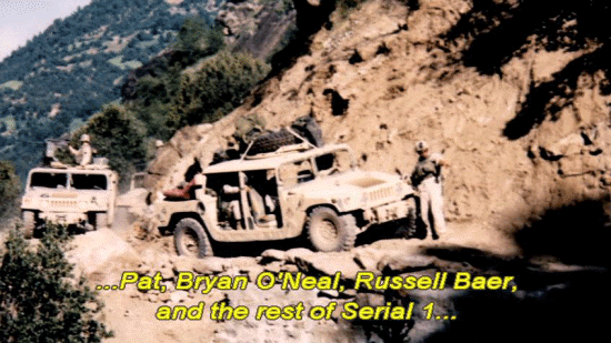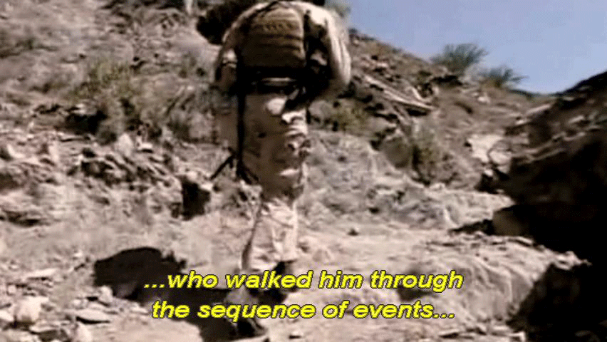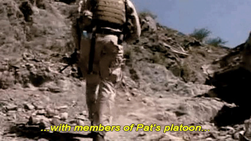 [Narrator] The Army's investigator returned to Afghanistan ... ... with members of Pat's platoon ... ... who walked him through the sequence of events ... ... and laid out the routes of the two serials. Traveling along a dry creek bed at the bottom of a narrow gorge ... ... Pat, Bryan O'Neal, Russell Baer, and the rest of Serial 1 ... |